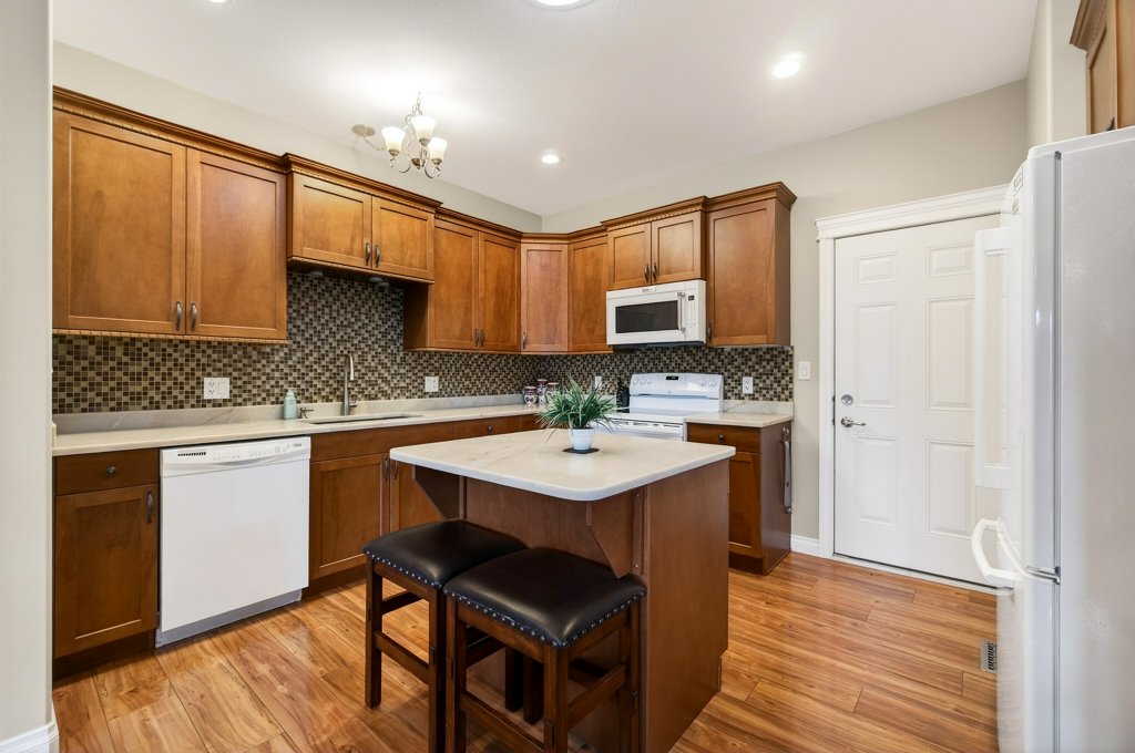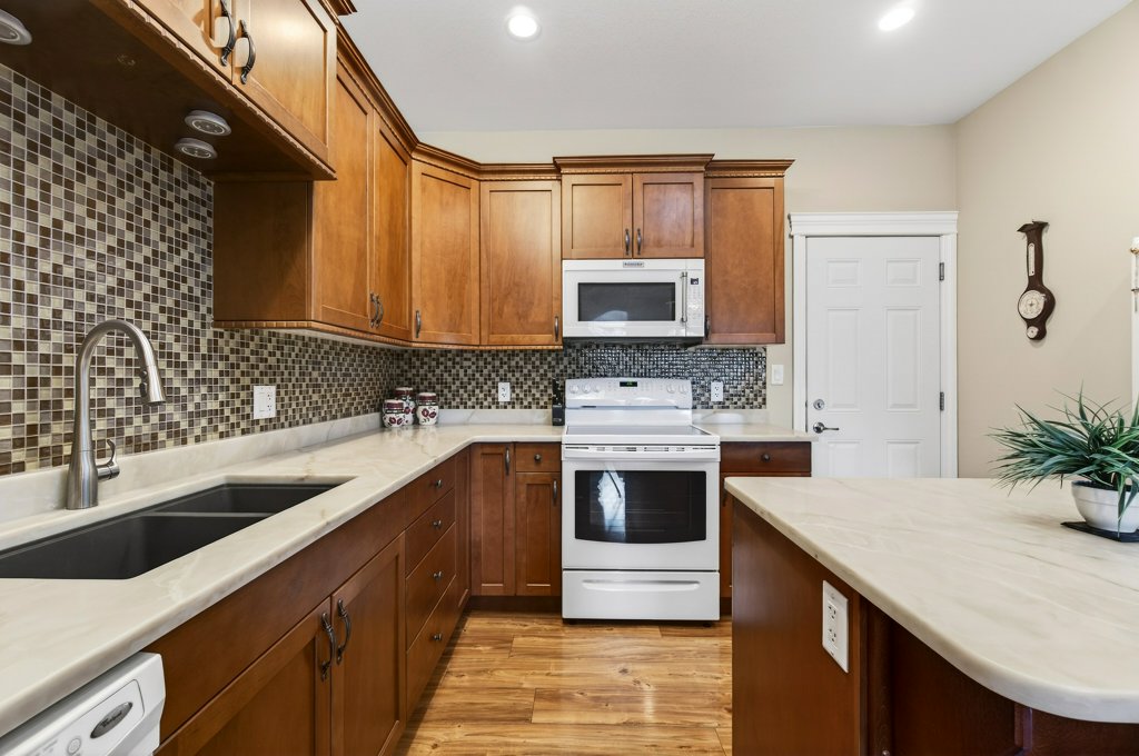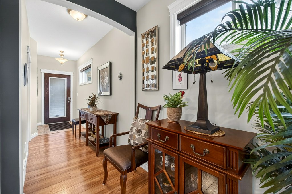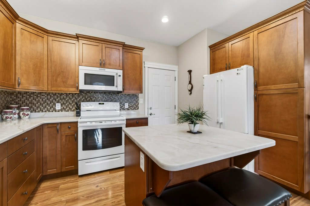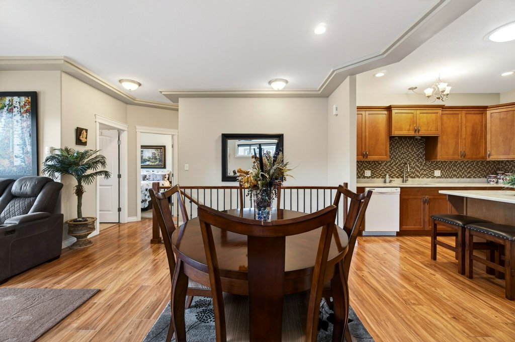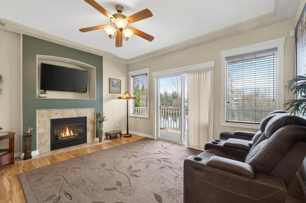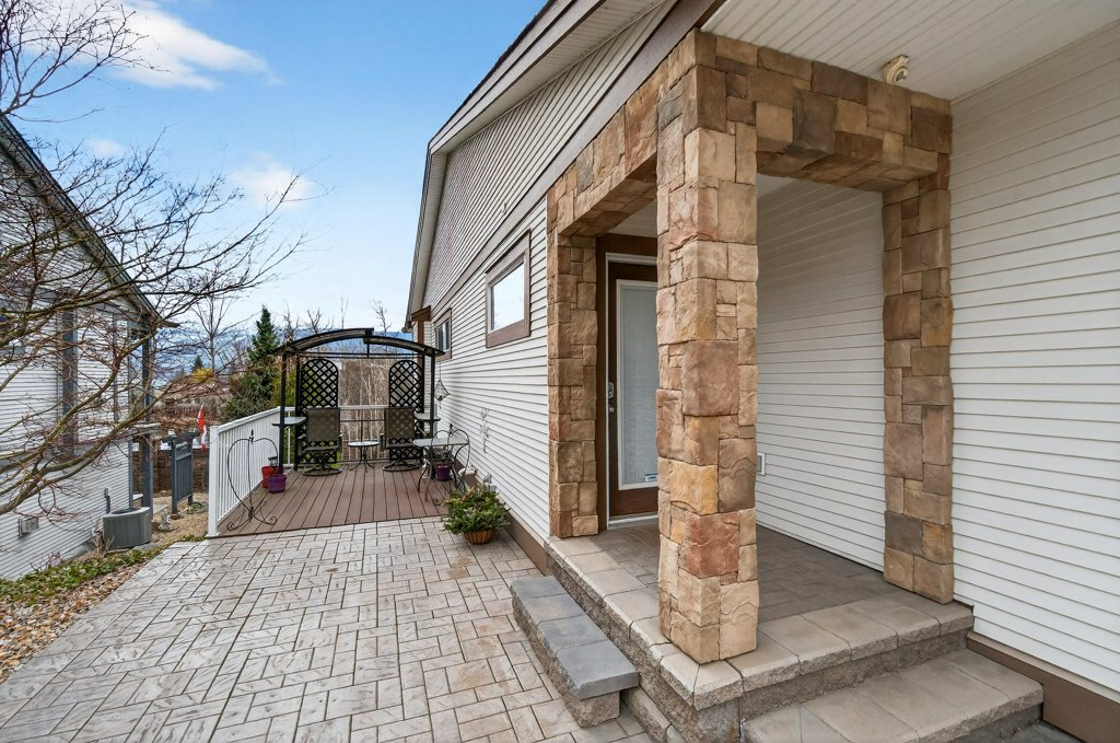Immaculate one-owner home offering 3 bedrooms, 3 bathrooms, level-entry living, and a walkout basement, located in the sought-after Sherwood Oaks 55+ community. This desirable development is conveniently situated near walking trails, recreational facilities, and amenities. Step inside to a bright, welcoming layout with 9-foot ceilings, central A/C, and numerous custom touches throughout. The main living area is warm and inviting, featuring a cozy gas fireplace and seamless access to the covered deck with a retractable awning—perfect for enjoying warm summer days while taking in the beautiful mountain, pond, and lake views. The dining area is enhanced by a sun tunnel that fills the space with natural light, creating a beautiful ambience both day and night, and flows effortlessly into the kitchen, which has been thoughtfully updated with new quartz countertops, a functional island, and excellent layout for everyday living and entertaining. The spacious primary bedroom offers a bright walk-in closet and a large 4-piece ensuite, creating a comfortable and private retreat. The second bedroom enjoys beautiful mountain views, while the conveniently located laundry room is equipped with a sink, cabinetry and newer washer and dryer for added ease of living. The walkout basement provides great flexibility with a large family room featuring an electric fireplace and patio doors that open to a private, landscaped backyard. The lower patio also features a retractable awning, creating a comfortable outdoor space to enjoy in any weather. You’ll also find a third bedroom, a 3-piece bathroom, an unfinished mechanical room, storage room, and an storage/workshop area with potential to be converted into a fourth bedroom. The garage is well-appointed with storage lockers, workspace, and a newer garage door opener. The property also offers ample additional parking. A beautifully maintained home combining comfort, functionality, and a highly desirable location!