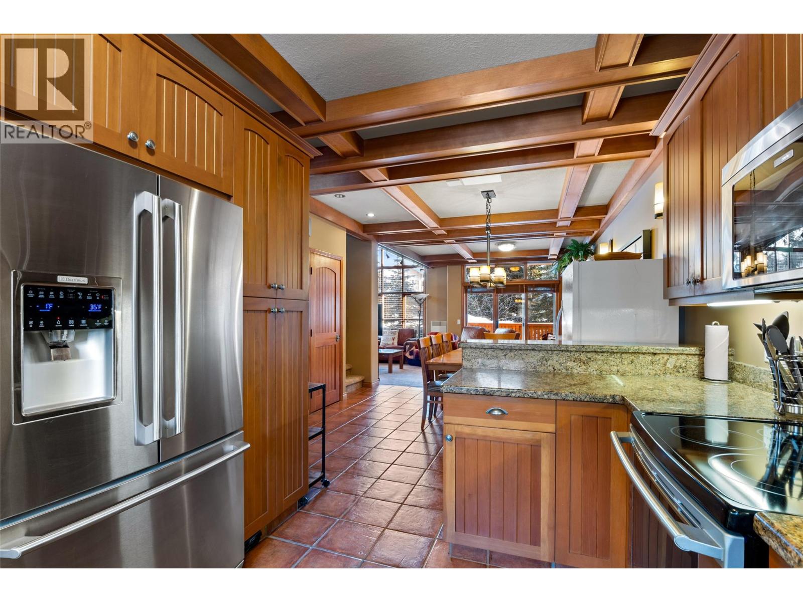 Positioned for true ski-in/ski-out living, this well-appointed townhome offers a layout with three bedrooms, three and a half bathrooms, and a spacious ski room. Located within the McGillivray Creek community, the home sits in close proximity to the Morrissey and Orient chairlifts and the Nordic trail network, placing year-round recreation right outside your door. This bright end unit is designed to feel warm and inviting, highlighted by vaulted ceilings, expansive windows, and rich wood detailing throughout, including a distinctive quarter-sawn Douglas fir feature ceiling. The living area features an updated gas fireplace, while heated tile floors in the kitchen, entry, and bathrooms add comfort after a day on the slopes. A large sundeck extends the living space outdoors, ideal for entertaining or relaxing in the alpine setting. The kitchen is both functional and stylish, offering granite countertops, newer appliances, and a custom built-in serving station with integrated workspace, opening seamlessly to the dining area. Updated lighting enhances the home’s clean, modern feel. The upper level features the primary bedroom with ensuite and private deck, along with two additional bedrooms and a full bathroom. The lower level adds exceptional functionality, featuring a heated secure garage with additional storage, a dedicated ski room for all your four-season gear, and a walk-out covered hot tub area complete with hot tub. Offered fully furnished, GST not applicable. (id:44574)